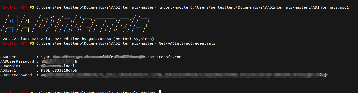 With the previously obtained domain administrator privileges it was possible to open a WinRM session on the Azure AD connect server. This server syncs all user information and password hashes between the on premise domain controllers and Azure AD in the cloud. This server, or more specifically the service accounts MSOL_* (on prem) and SYNC_* (Azure AD) used by this server require a high level of privileges in both the On Prem Active Directoryt and Azure AD.